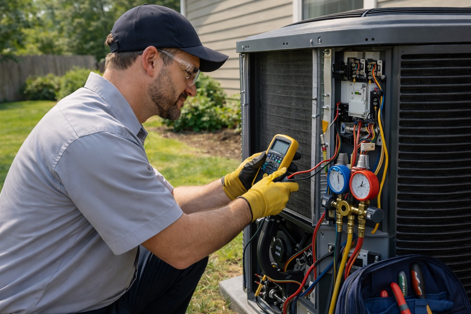 HVAC technician testing AC condenser during routine maintenance.